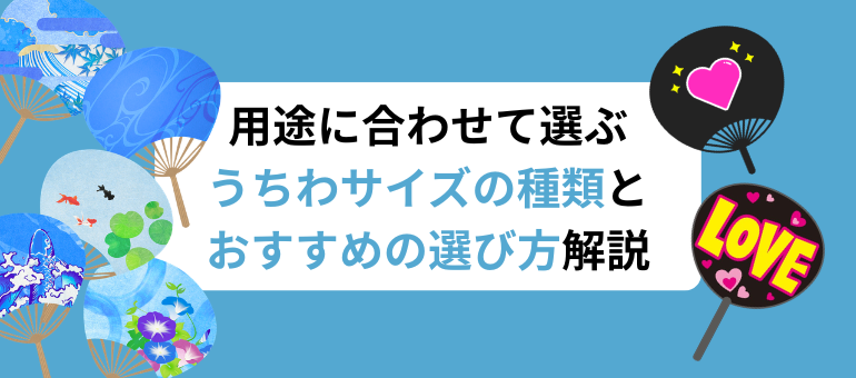 うちわのサイズと用途について解説しています。うちわにはスタンダード、小さめ、ボールファンなどさまざまなサイズや形状があります。またうちわはあおぐだけではなく、応援や販促など様々な場面で使われます。用途に応じて適したサイズを使い分けましょう。この記事を読む